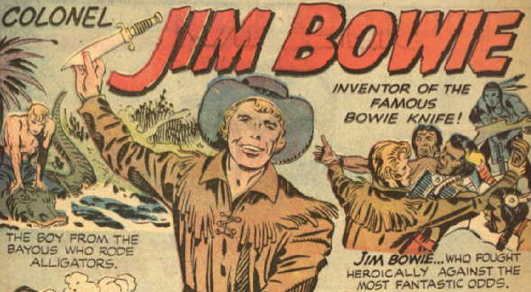 Even 20th Century western comics like this one were quick to draw associations between the knife and its namesake- “Inventor of the Famous Bowie Knife!” appears on the cover of this comic about the adventurer.