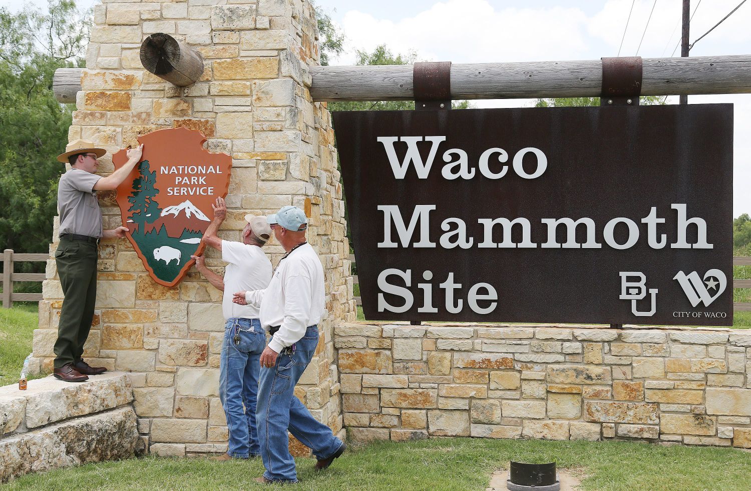 A national park service sign is put up at the Waco Mammoth Site after it becomes a national monument