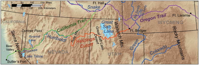 It was not uncommon for California and Oregon emigrants to carry Hastings’ guidebook among their belongings. Jacob Donner (who died in the ordeal) was said to have kept a marked-up copy in his saddlebag, though the item was never recovered by rescuers. Storytellers continue to assert that the Donners fell behind because they took a disastrous shortcut “promoted” by the book. This so-called “Hastings Cutoff” directed emigrants to leave the main California Trail at Fort Bridger and travel southwest around the Great Salt Lake, saving 400 miles of journey.